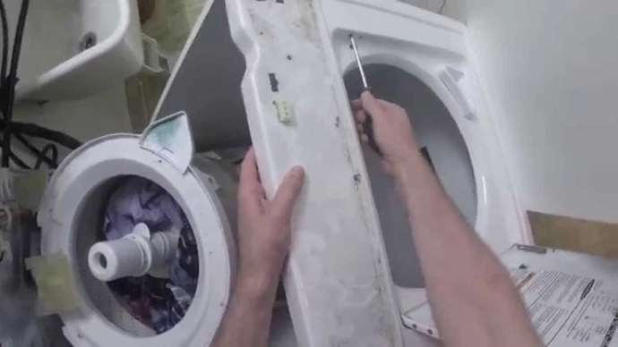 يقوم الفني بالفحص الدقيق للغسالة الكهربائية في المنزل لتحديد الأعطال بدقة.